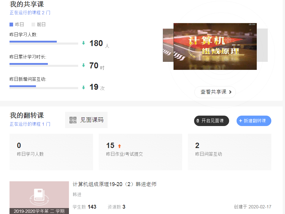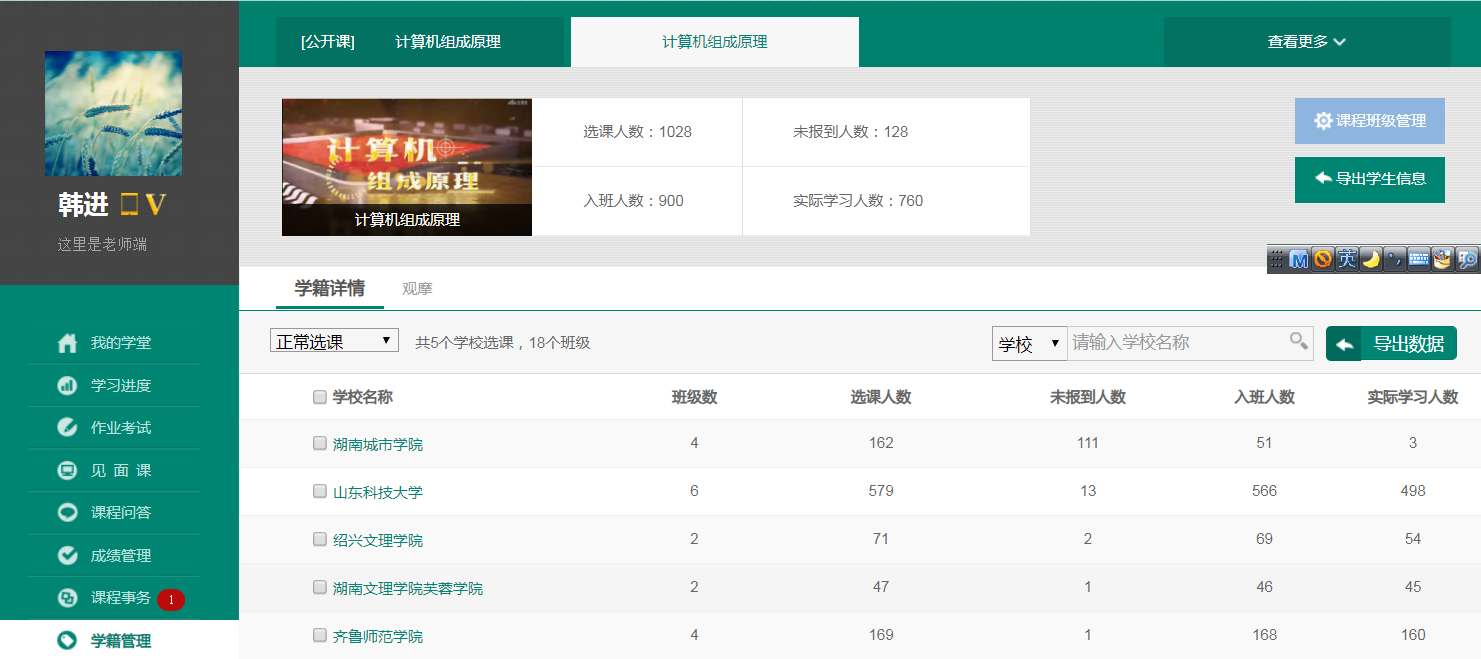 面对特殊情况,团队骨干老师韩进、东野长磊、薛庆军、于建志、刘连山通力合作,从2019年6月开始,便投入了大量的时间和精力,在学校在线开放课程项目的支持下,紧锣密鼓地完成了《计算机组成原理》的视频录制。寒假期间,面对突发的疫情,韩进老师与智慧树平台紧密合作,牺牲了假期休息时间,使在线课程资源顺利通过审核,并于开学第2周正式上线运行。目前我校《计算机组成原理》共享课程已被包括我校在内的5所高校选为线上共享课程。
