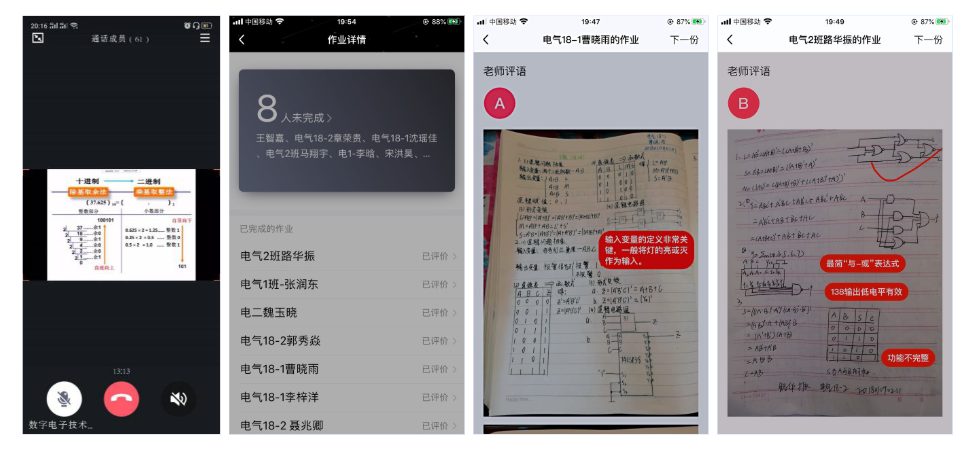 刘春晖老师开学之初采用智慧树平台的见面课给学生直播授课,由于学校开学早,第一周的网络状态良好,上课效果非常理想。但第二周之后随着全国大中小学都陆续开课,网络比较拥堵,平台半天登陆不上。而且《数字电子技术》课程有大量的公式、图和表,课件需要有大量的动画分解和分步推演,以确保授课效果。但智慧树平台为了平台平稳运行,暂不支持课件播放动画。通过对多个直播平台的充分调研,分析各直播平台利弊,结合课程特点,及时调整为“QQ屏幕分享+视频录制”的授课方式。直播授课中随机抽取学生回答问题,根据学生的回答边讲边写,逐步分析学生解题思路是否正确,基本达到了“实体课堂”授课的效果。课程结束后,可根据需要将录制的直播授课视频发布在学生班级群,方便学生回看,解决了部分学生跟不上讲课节奏的问题。
