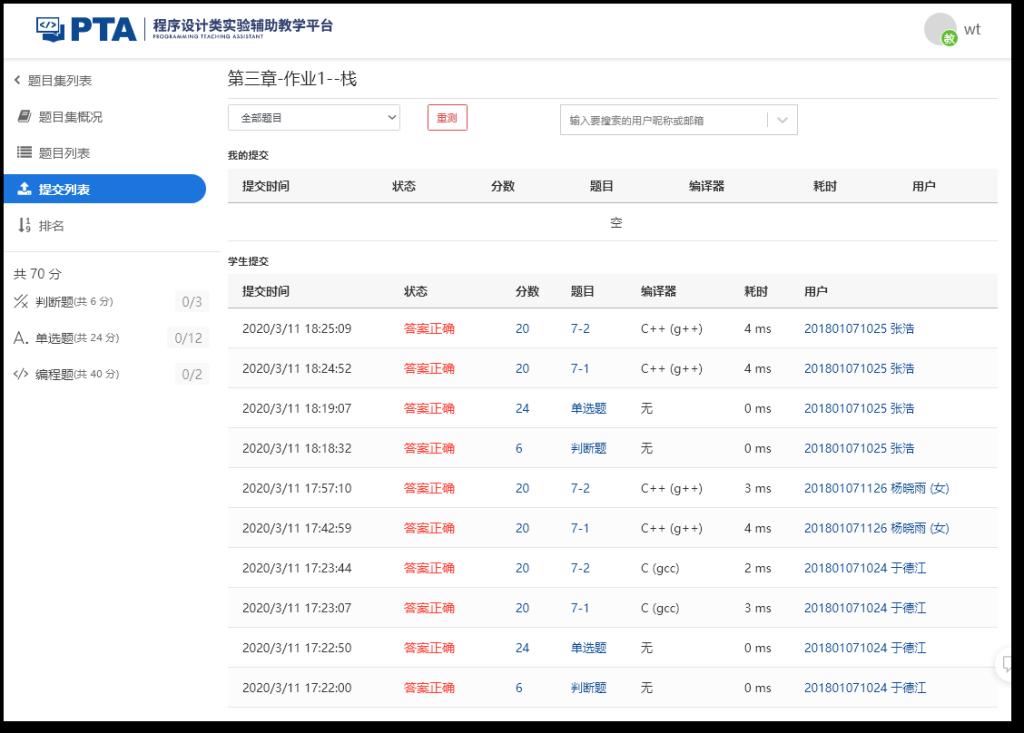 除了线上直播授课,在线下还利用PTA平台将课程作业布置给学生,让学生线下在网站提交作业,做到理论教学和实践教学的同步。对PTA的作业设置截止时间,督促学生及时完成作业,通过作业对所学知识进行回顾和检验。每次作业完成后,老师都会分析学生的提交情况和分数,更好地了解学生对知识的掌握情况,有针对性调整后续教学方案,提高学生学习效率。另外,授课平台的直播回放使学生在课后可以随时复试课堂内容,加深知识理解。
