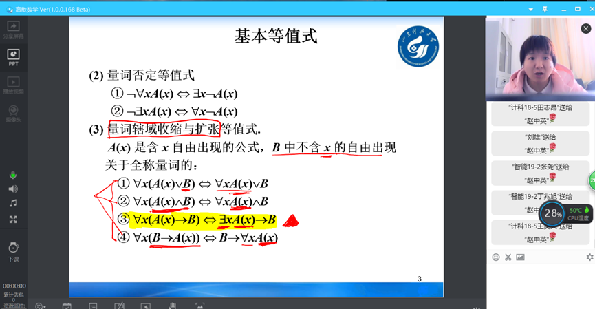 2.上课过程中的知识准确传输:由于离散数学课程有较多的公式推导,为解决线上课程无法板书的难题,老师们准备好电脑手写板等模拟板书,提高了学生的课堂效果。及时掌握和解答直播评论区的学生提问,使学生对课程知识有了更好的掌握。