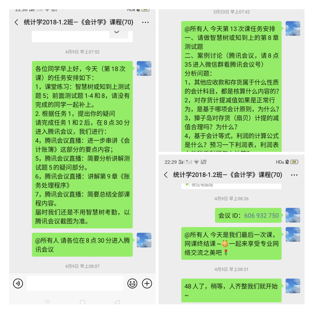 面对突如其来的新冠肺炎疫情,按照学校和学院的安排和具体要求,2月初《会计学》课程教学小组启动网络教学准备,加强联系讨论,各任课教师联系所教班级学生、建立微信群,引导学生注册教学平台、登录选课,联系出版社选择好电子版资料。同时,设计好授课内容、教学方式和教学节奏,制定自建课程和共享课程等线上视频的利用、直播和录播的相互补充策略。(详见李芳老师:线上教学经验分享系列之十三——《会计学》线上教学:利用混合线上教学模式,打造立体云端课堂)。
