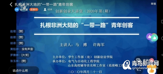 近日,2020年第一期“创新创业大讲堂”正式开讲,主讲嘉宾远在非洲大陆,在抗击疫情的特殊时期,通过“云端讲堂”为学校900余名本科生和研究生讲述了所做所感、进行了互动交流。面对大讲堂的线上直播新形式,同学们接受良好,参与踊跃、反响热烈。
