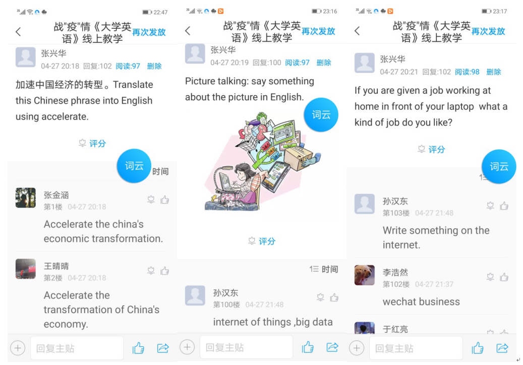 该环节不仅对学生前期自主学习效果进行检测,同时培养学生语言产出能力及师生互动协作能力。教学互动开始前,教师会通过系统“通知”告知学生互动具体时间、设备要求、签到手势及互动结束需要提交的东西。为了保证互动过程中学生观看视频与回答问题同步进行,要求学生电脑、手机并用。用电脑观看指定章节教学视频,用手机登陆“学习通”及时查看老师提出的相关问题并给出解答。同样,互动过程中教师也与学生一样电脑、手机并用。教师登陆手机“学习通”教师端,通过“投屏”功能将所有手机开展的活动展示在眼前电脑屏幕上。教师通过手机端上的活动库中“主题讨论”向学生发出需要回答的问题。之所以电脑、手机并用是因为电脑具有更大显示效果,无论学生观看教学视频还是教师查看学生动态答题,均不会因为长时间观看屏幕而导致视觉过度疲劳;此外,由于手机智能化较高,通常具有英汉“语音输入文字识别”功能,大大节省文字输入时间,提高师生教学互动速度。此外,电脑、手机并用也大大减少屏幕切换频率,不会忙中出错。互动过程主要是教师提问,学生作答。所提出的问题均与之前学生自主学习的章节教学内容相关,问题涉及多个方面,如:短语及句子翻译(英译汉或汉译英)、英语词汇拓展、看图说话、内容总结概况、回答问题、用词或句式造句等。这些问题不仅考察学生阅读理解能力,更注重学生语言产出。