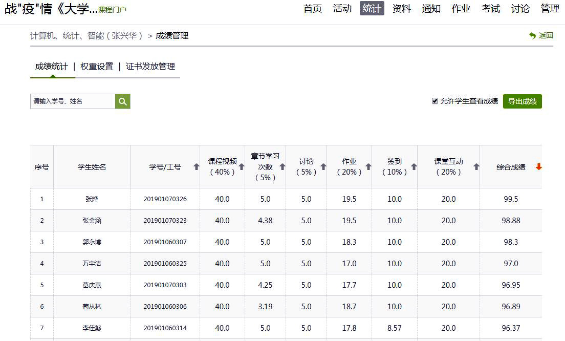 过程性学习各项成绩权重及学生得分情况
