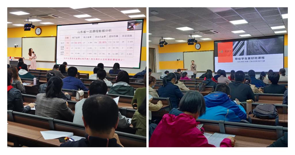 教务处副处长刘冰分析了国家和山东省一流本科课程建设现状,介绍了我校在线课程资源建设情况和支持政策,希望各课程负责人高度重视在线课程资源建设,做好基于混合式教学的课程设计,融入课程思政元素,为申报线上线下混合式一流课程和推进混合式教学模式改革做好准备。