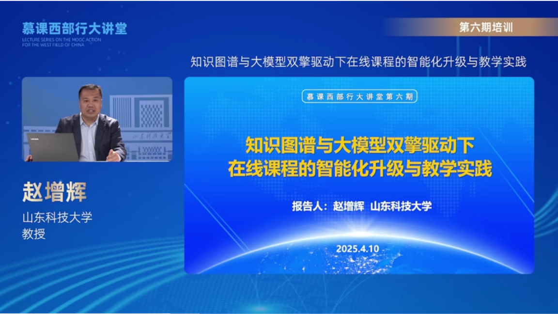 培训邀请了taptap点点体育赵增辉教授和青岛理工大学孙林娜教授进行了报告。赵增辉教授以“知识图谱与大模型双擎驱动下在线课程的智能化升级与教学实践”为题,介绍了知识图谱和大模型双擎驱动下,在线课程到智能化慕课的升级路径,解析了数智化赋能的混合式教学设计模式并举例说明了基于智能化慕课的混合式教学实践。孙林娜教授分享了数智化教学与教师素养发展关系、以学生为中心双框架混合式教学设计和过程性课程评价,展示了数字化转型赋能教育教学改革具体实践和新思考。