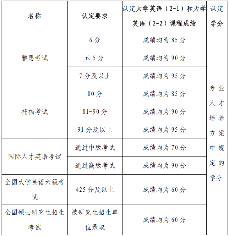 1.英语课程学分认定。参加雅思考试、托福考试、国际人才英语考试、全国大学英语六级考试、全国硕士研究生招生考试等且达到认定要求,可申请认定大学英语课程学分及成绩,学分及成绩认定标准如表1所示。中外合作办学各专业的英语课程学分认定由济南校区(斯威本学院)参照本办法另行制定,报教务处备案。