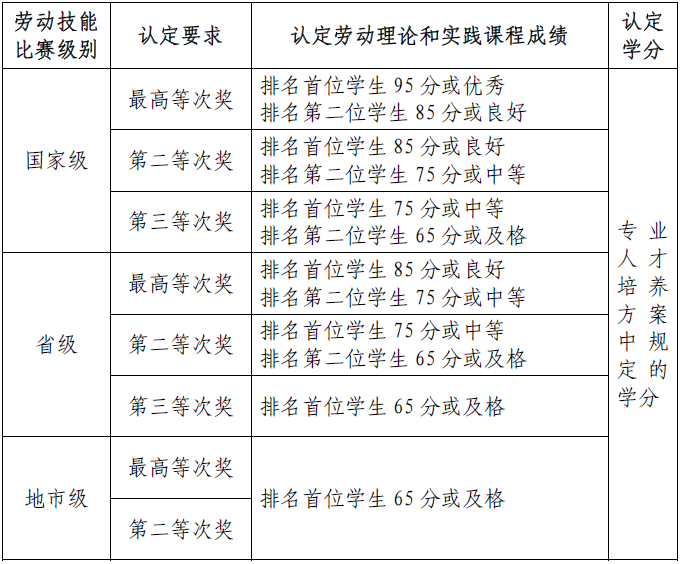 劳动课程认定。在学校统一组织参加的地市级政府部门及以上劳动技能相关比赛中获得奖励(仅限前两位获奖学生),可申请认定劳动课程(含理论和实践)学分及成绩,学分及成绩认定标准如表4所示。
