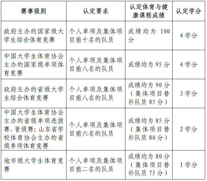 3.体育与健康课程学分认定。在学校统一组织参加的地市级及以上体育赛事中获得比赛奖励,可申请认定体育与健康课程学分及成绩,学分及成绩认定标准如表3所示。