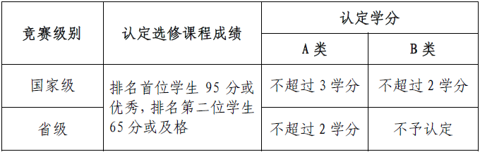 2.选修课程学分认定。参加学生科技竞赛活动,获得学校认定的省级竞赛第一等级或者国家级竞赛第二等级及以上者(仅限前两位获奖学生),经指导教师推荐,开课学院同意,可申请认定一门与竞赛内容紧密相关且符合认定学分规定的选修课程学分及成绩,学分及成绩认定标准如表2所示。学生在弹性修业年限内所取得的所有竞赛获奖只能认定1门选修课程学分及成绩。竞赛级别根据学校最新的学生科技竞赛相关管理办法确定。